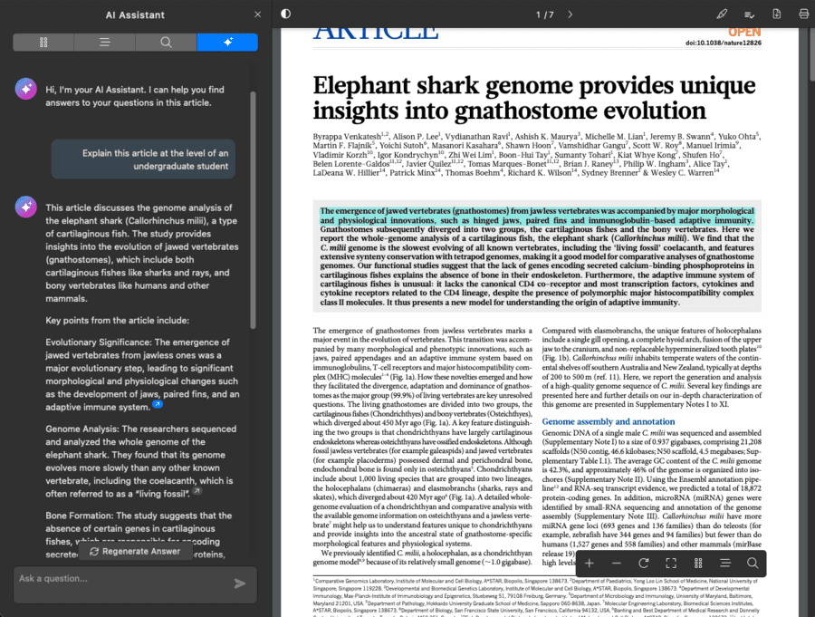 AI Assistant 使用生成式 AI 来分析您的问题,并尝试在所选 PDF 的上下文中识别答案。它利用存储在大型语言模型中的一般知识以及您打开的 PDF 的特定上下文来解释和回答您的问题。